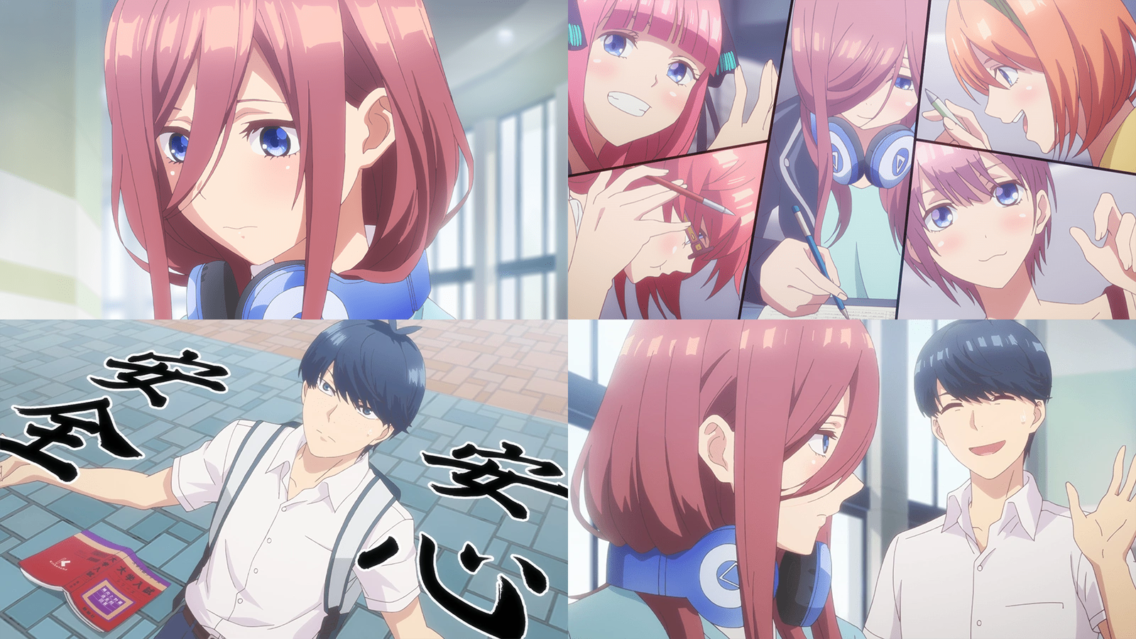 Después, Fuutarou se acerca a Miku para desafiarla, sin embargo, ella se escapa. Durante la persecución, se entera de la capacidad de Miku para hacerse pasar por su hermana (Yotsuba). Después de enterarse de que las hermanas tienen el potencial de mejorar sus puntajes bajos, Fuutarou le dice a Miku que hará que las Quintillizas Nakano se gradúen con una sonrisa. Miku, tocada por sus palabras, se une a Yotsuba en la sesión de clases de Fuutarou.